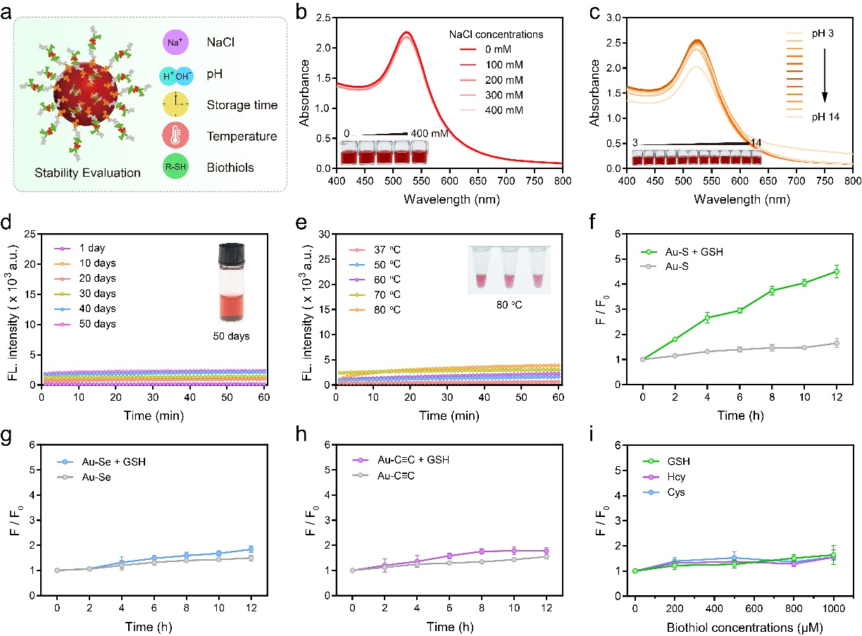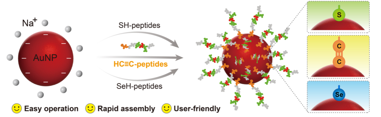 金纳米颗粒(AuNPs)因其独特的物理化学特性而备受关注,包括高消光系数、优异的生物相容性、尺寸依赖的光学特性以及高效的荧光共振能量转移(FRET)能力。基于这些特性,研究者们通常通过金-巯(Au-S)共价键将各类功能分子(如抗体、适配体、多肽和聚合物等)修饰到AuNPs表面,构建多功能纳米探针。这些功能化的AuNPs在生物传感、细胞成像、药物递送和疾病治疗等领域展现出巨大的应用潜力。然而,Au-S键固有的化学不稳定性限制了其实际应用:在复杂的生理环境中,特别是面对细胞内高浓度的生物硫醇(如谷胱甘肽,半胱氨酸等)时,Au-S键容易发生配体交换反应,导致探针结构破坏和功能丧失,最终造成检测信号失真,严重影响其在生物医学应用中的可靠性和准确性。这一局限性促使研究者们致力于开发更稳定的AuNPs表面修饰策略。