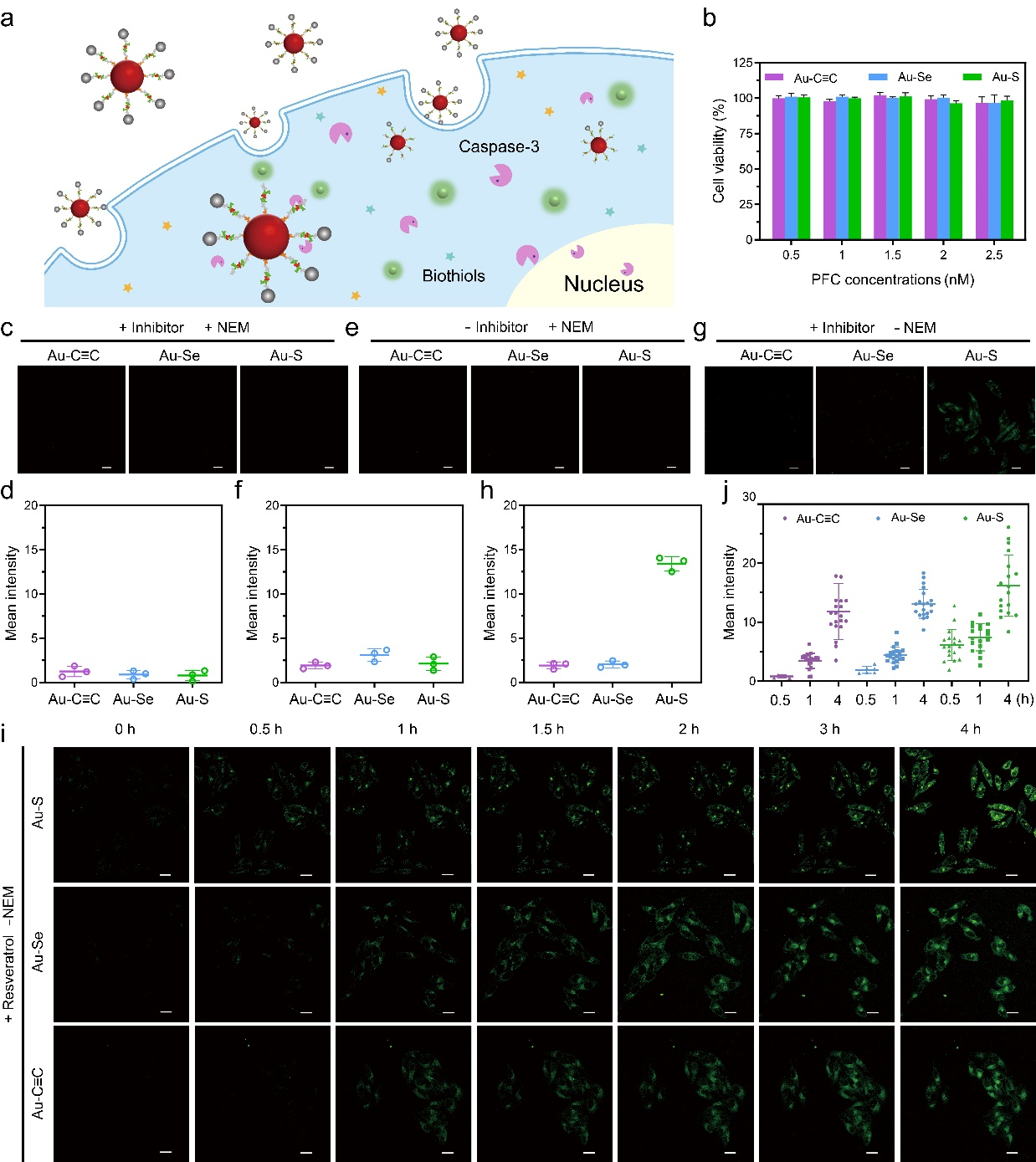 作者评估了基于Au-C≡C键的肽链纳米金探针在肿瘤细胞成像中的信号保真度。研究结果表明,细胞内的生物硫醇不会干扰该探针的信号输出,只有Caspase-3对探针上肽链的特异性切割才能产生有效的成像信号。这一特性显著提高了检测信号的保真度和特异性,为细胞成像分析提供了一种更为可靠的工具。