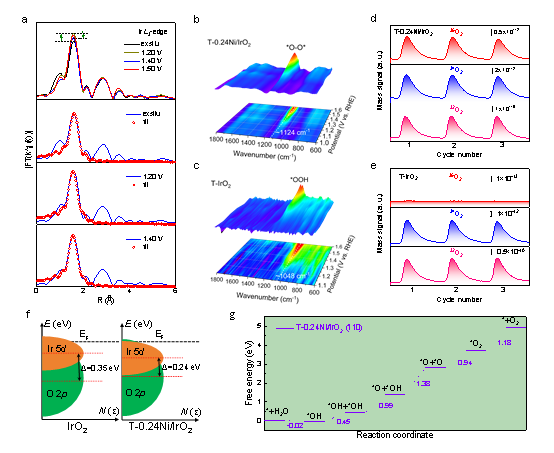 本工作通过模板限域-生长策略制备了Ni原子掺杂的IrO2 (T-xNi/IrO2, x = 0.05, 0.16, 0.24, 0.36)催化剂,不同低价的Ni掺杂量会在IrO2中引入不同程度的压缩应力和氧空位,Ni掺杂不仅通过压缩应变诱导晶格畸变增加Ir─O的共价性,而且还产生富氧空位(Ov)来调节Ir位点的电子结构,从而提高了酸性OER。原位同步辐射傅里叶变换红外光谱和X射线吸收精细结构光谱验证了两个水(H2O)分子在Ir和相邻的Ov (Ir─Ov)对上的快速吸附,直接耦合*O─O*中间体,绕过缓慢的*OOH。结合理论计算,在T-IrO2中掺杂Ni可以调节Ir 5d -和O 2p -带中心,增加Ir 5d和O 2p轨道的重叠,触发连续的金属位-氧空位协同机制(MS-OVSM)反应途径,增强活性和稳定性。