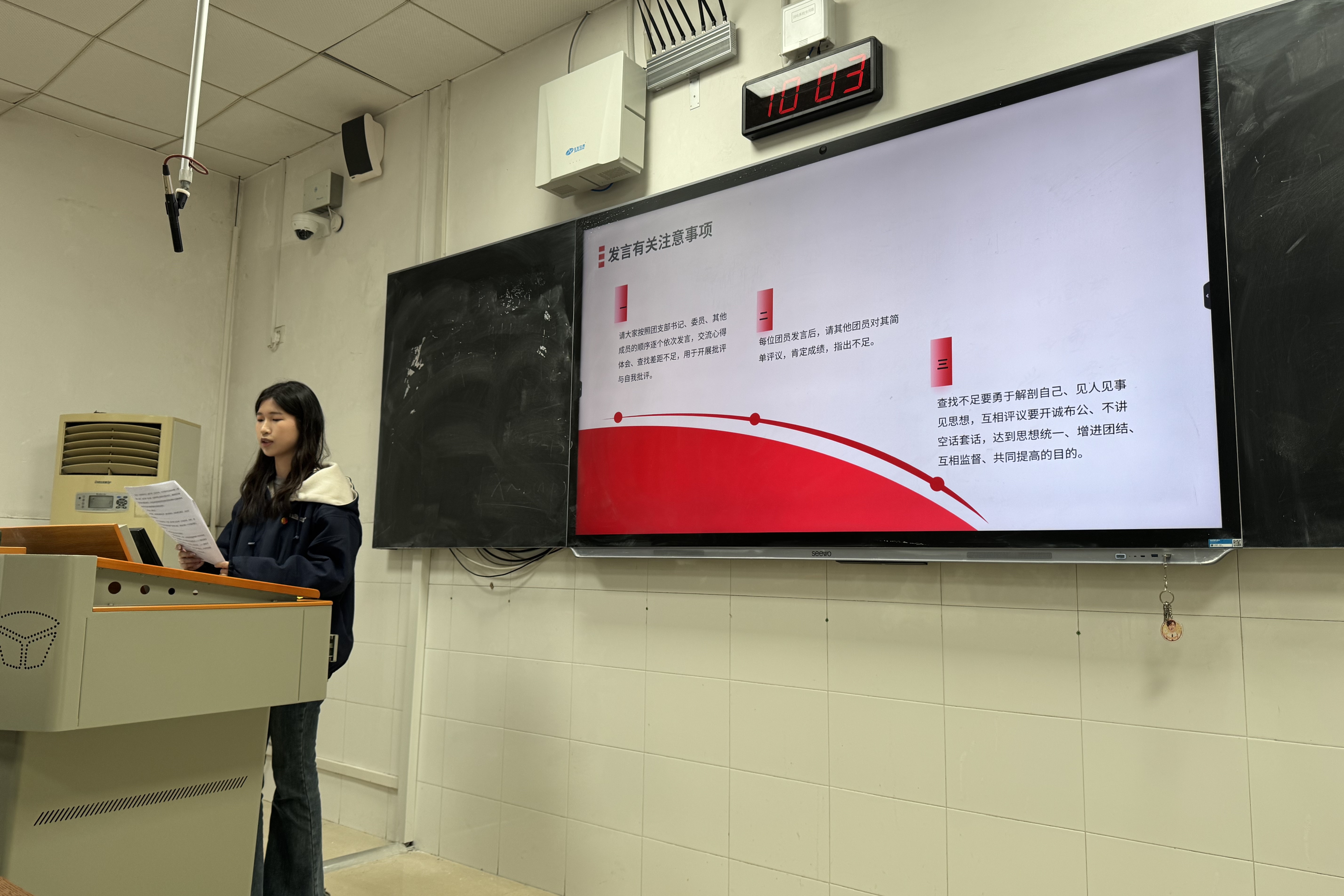 在关于团纪的交流发言中,会议全体成员按照团支部书记、委员、其他成员的顺序逐个依次发言,交流心得体会、寻找差距不足、开展批评与自我批评。全体团员共同总结出理论学习碎片化,团日活动主动性缺乏等问题,王鸣婵提出大家要相互监督,增进团结,共同提高。