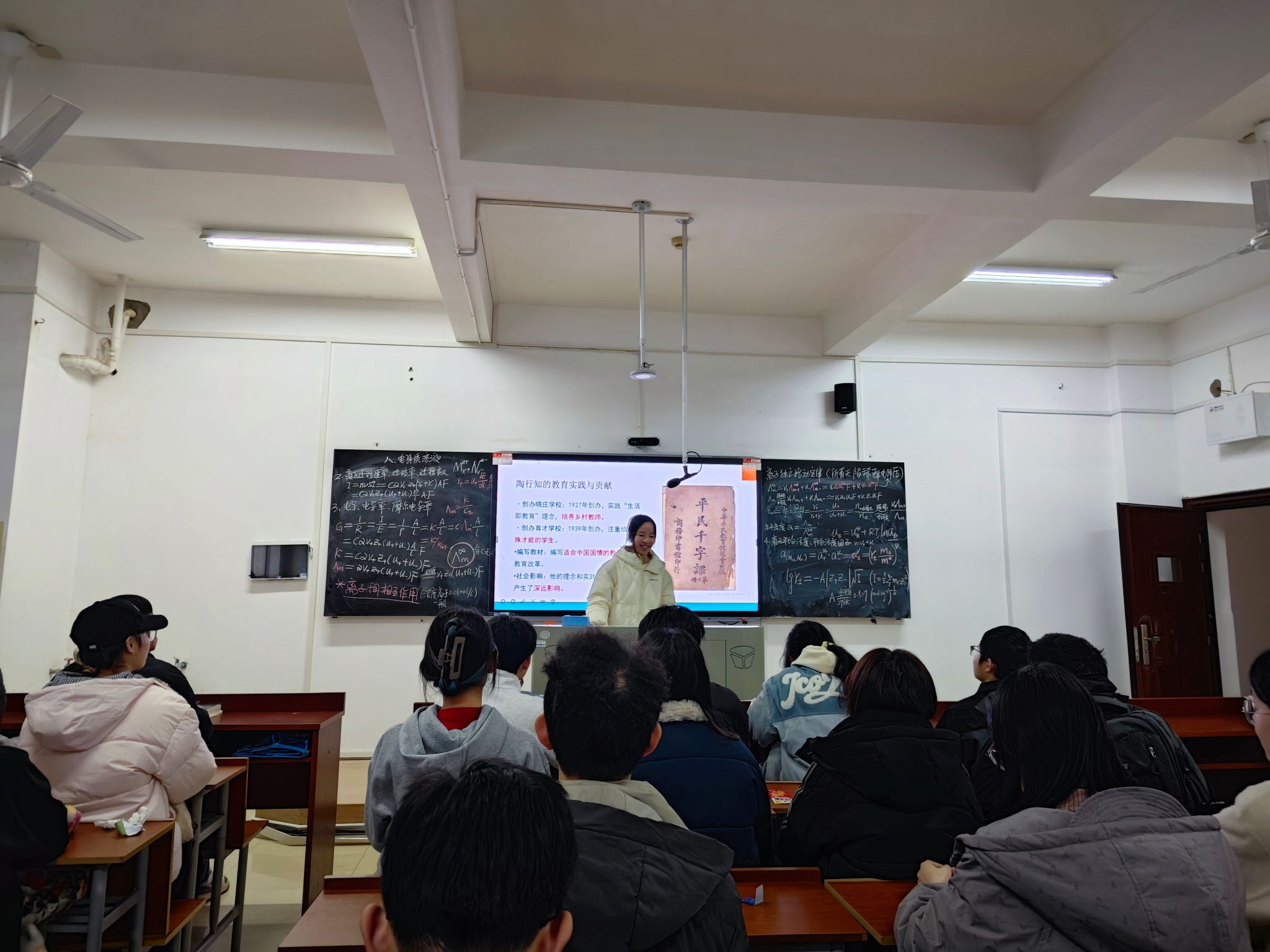 活动伊始,喻姹嫣向同学们介绍了《教育强国建设规划纲要》(以下简称《纲要》)的核心目标和七大战略任务,让大家对《纲要》有了初步的了解。随后,喻姹嫣将话题引向了中国近代著名教育家陶行知,详细讲述了他的教育理念、卓越贡献以及所获得的荣誉。通过对比《纲要》中的具体要求与陶行知的教育实践和理念,同学们看到了理论与实践的紧密联系,对教育问题进行深入思考。