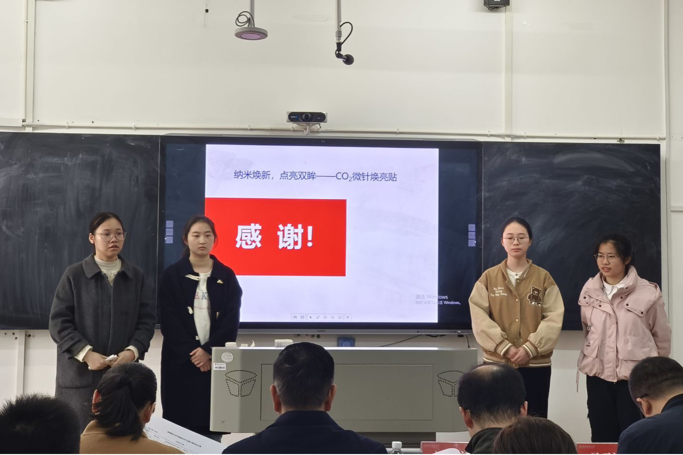 主持人介绍完比赛规则后,四支队伍依次进行现场阐述和答辩,其中三组为主赛道本科生创新组,一组为青年红色筑梦之旅赛道公益组。黄嘉汶团队结合如今医疗与社会需求,创新设计出拥有更高性价比的新一代硅酸镁铝绿色药剂粘合剂;王天一团队聚焦于近年来抗生素滥用导致水体污染的社会现象,研发出操作简单、实用性强的新型吸附材料;韦婷团队关注于困扰当代年轻人的黑眼圈问题,研究出操作简单方便、安全风险更低的CO2微针焕亮贴;邓姣阳团队结合乡村学校实验安全教育存在的问题,构建出乡村虚拟仿真实验平台。