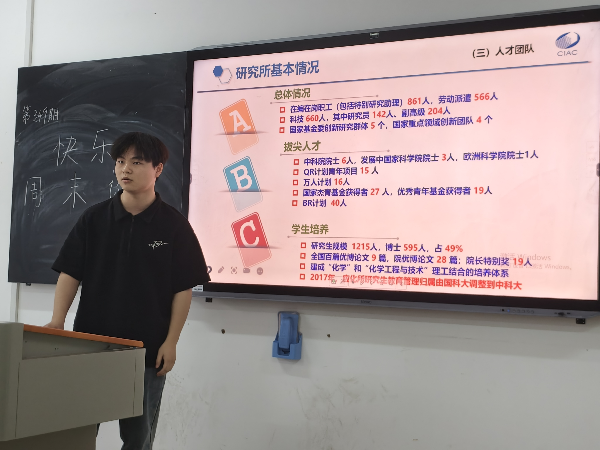 (通讯员 龙亦洲)4月13日下午,化工院学生会办公室在化工楼324教室开展了第349期快乐周末谈活动,此次快乐周末谈活动的特邀嘉宾为2021级学生李响和宋健韬,此次活动中,李响和宋健韬结合自身经历,与同学们分享考研技巧并详细介绍了中科院长春理化研究所的学科优势与招生政策。