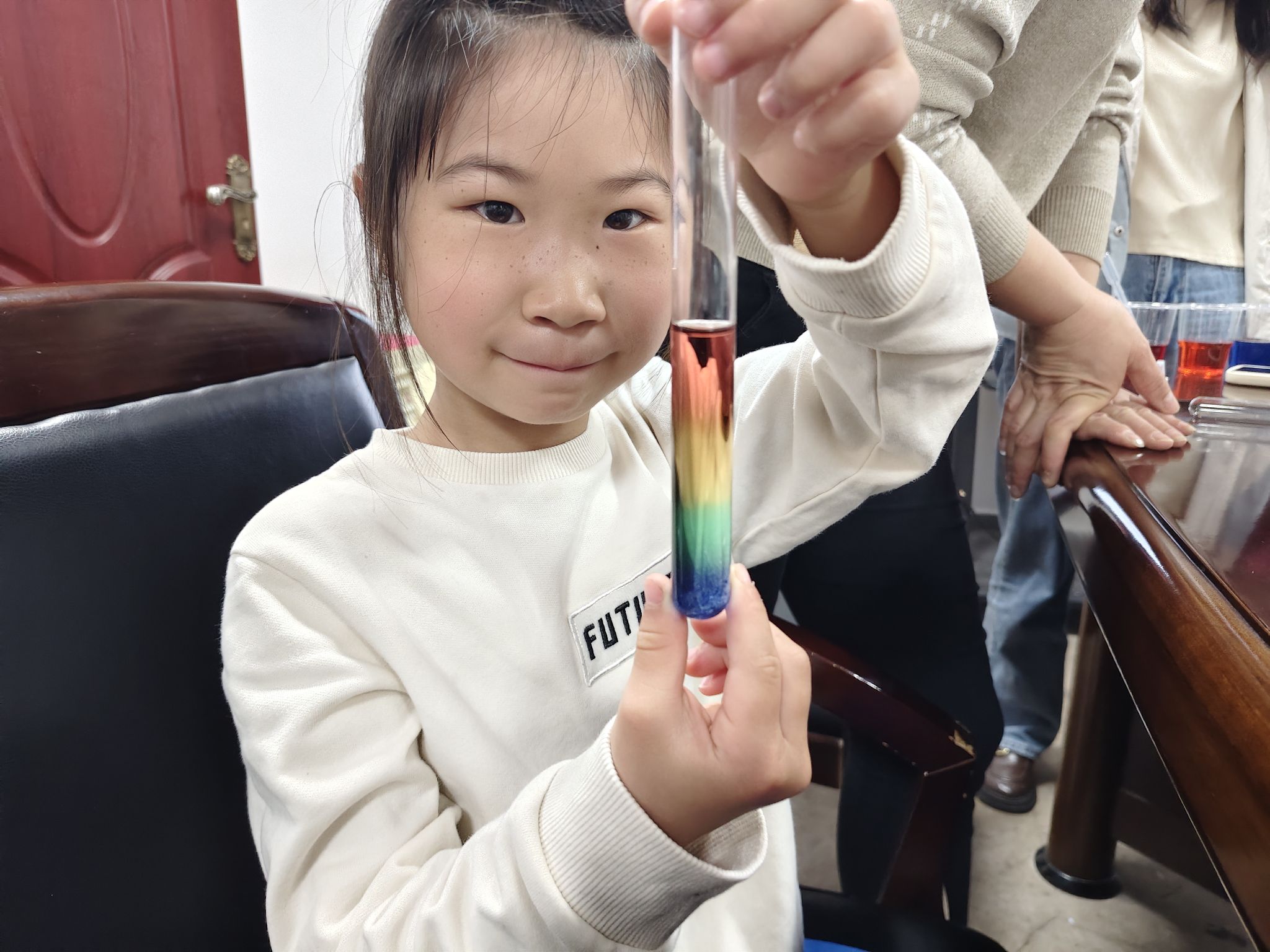 志愿者们按照预定时间在岳南村社区党群服务中心集合,等待社区工作人员将参与此次活动的小朋友们带到活动场地。在活动期间,主讲人姚芳从生活中“石头为会沉入水底”这一现象引出密度的相关概念并展开讲解,在主讲人演示正确的实验操作后,志愿者带领小朋友有序领取实验材料并完成了“水中烟花”和“一管彩虹”两个实验,在实验中观察到加有色素的牛奶在盐水中绽放出烟花及不同密度的有色盐水在试管中形成了彩虹的神奇实验现象。整个活动过程轻松愉快。