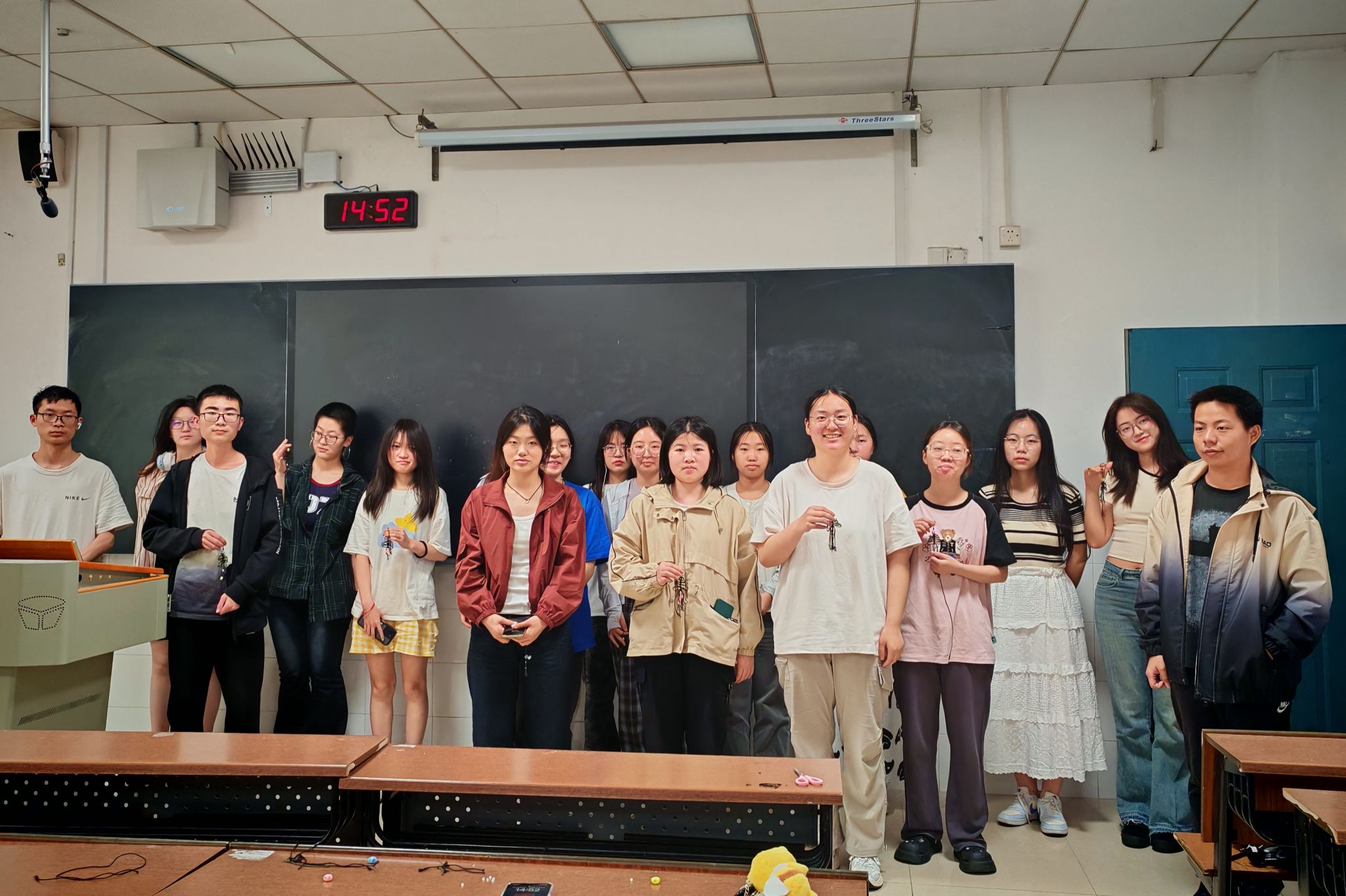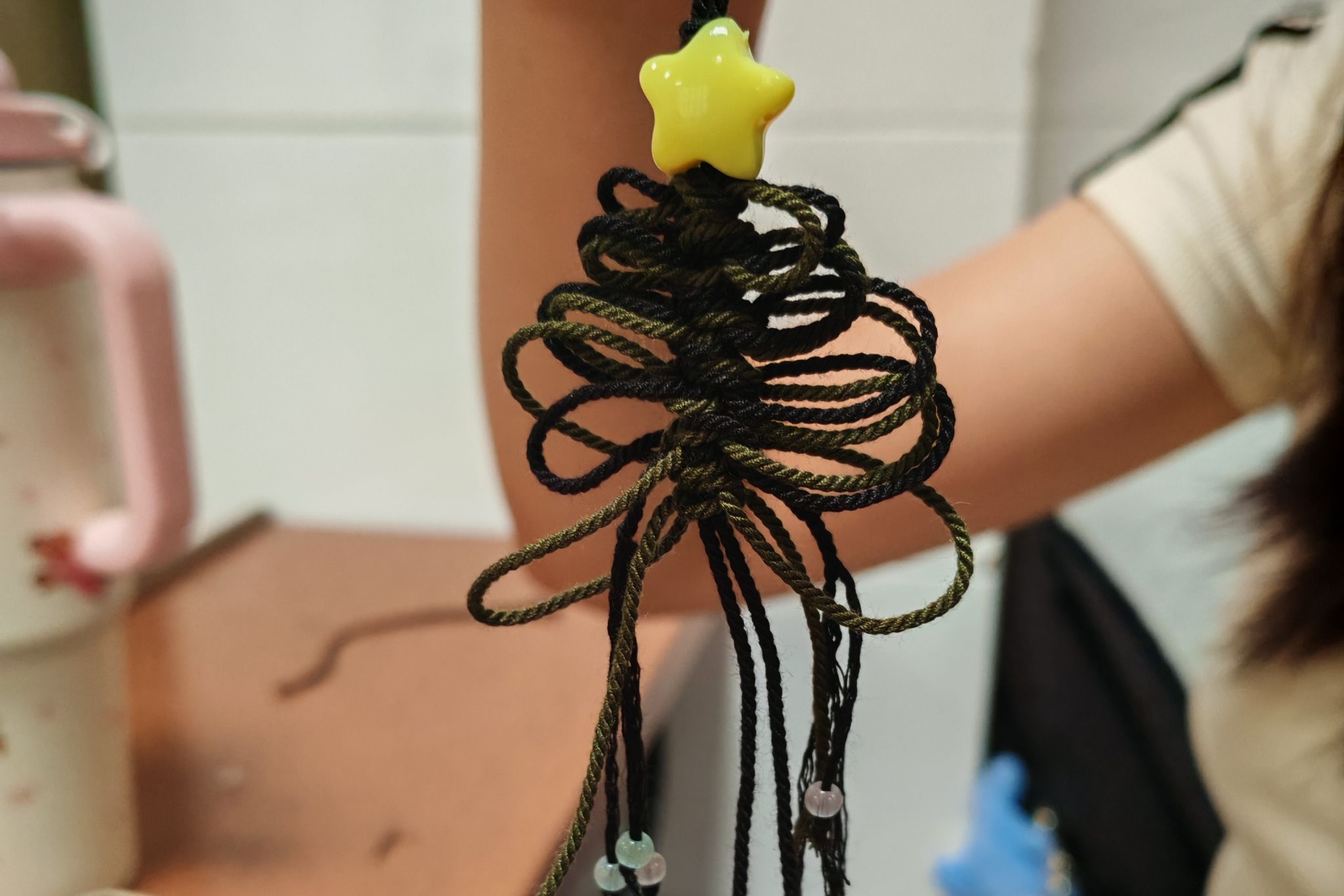 活动现场,理事会成员负责活动材料的准备以及现场的工作安排。会员们积极参与此次活动,按照教程认真编织挂件。在缠绕编绳、系出绳结的过程中,会员们专心致志;穿入米珠、配上配饰时,会员们各显身手;勾勒圣诞编绳并调整挂件形状时,会员们充分发挥丰富的想象力与创造力,打造出圣诞编绳挂件。活动尾声,会员们拿着精心制作的挂件,在教室前合影留念,记录下这一美好瞬间。