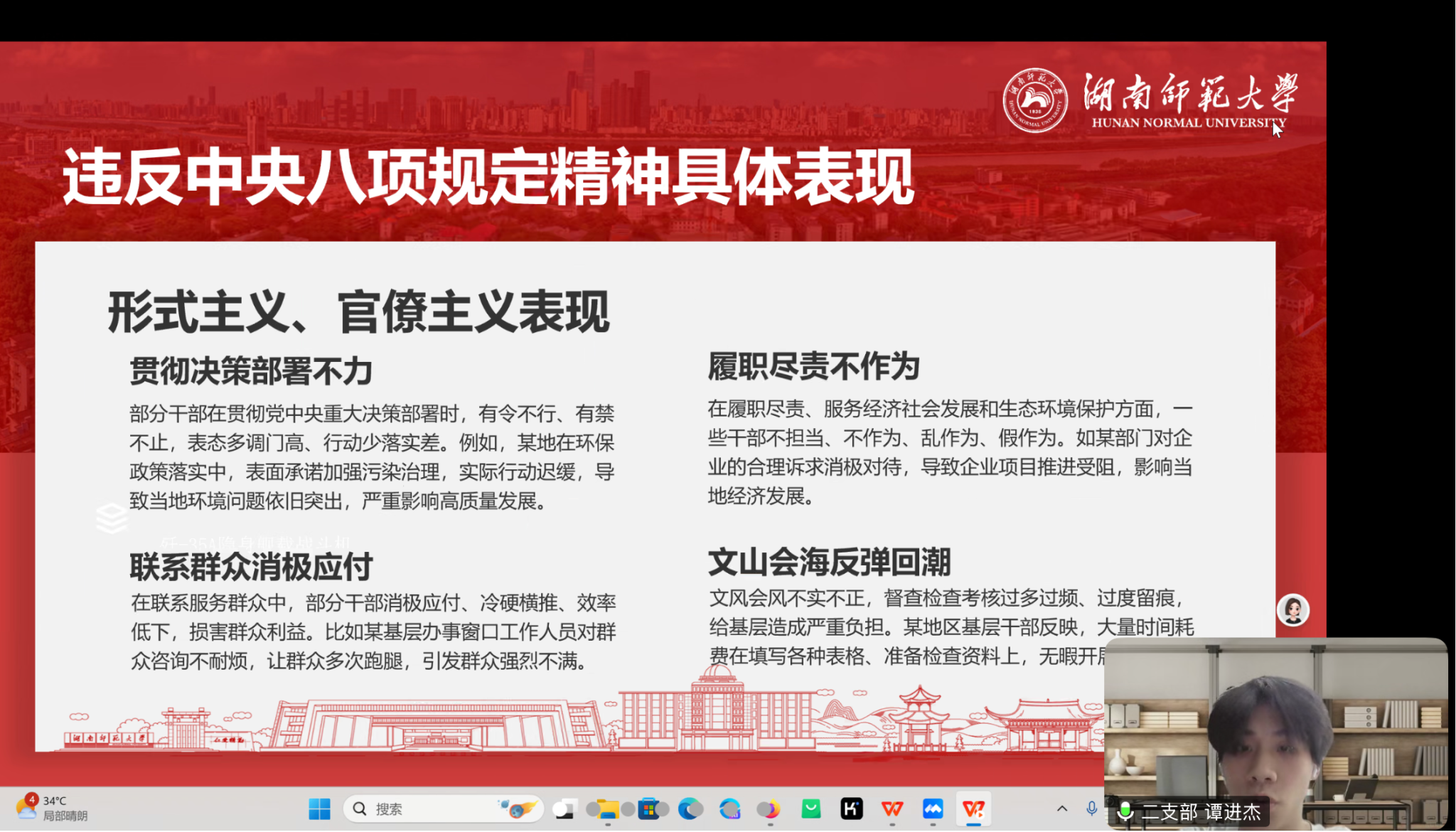 柴琳详细阐述了中央八项规定出台的背景,并通过播放相关视频深入解读了中央八项规定的主要内容和具体要求;第二党支部党员谭进杰深入剖析了违反中央八项规定精神的具体表现;第三党支部党员蔡紫婧详细介绍了与中央八项规定精神相关的主要党纪党规。