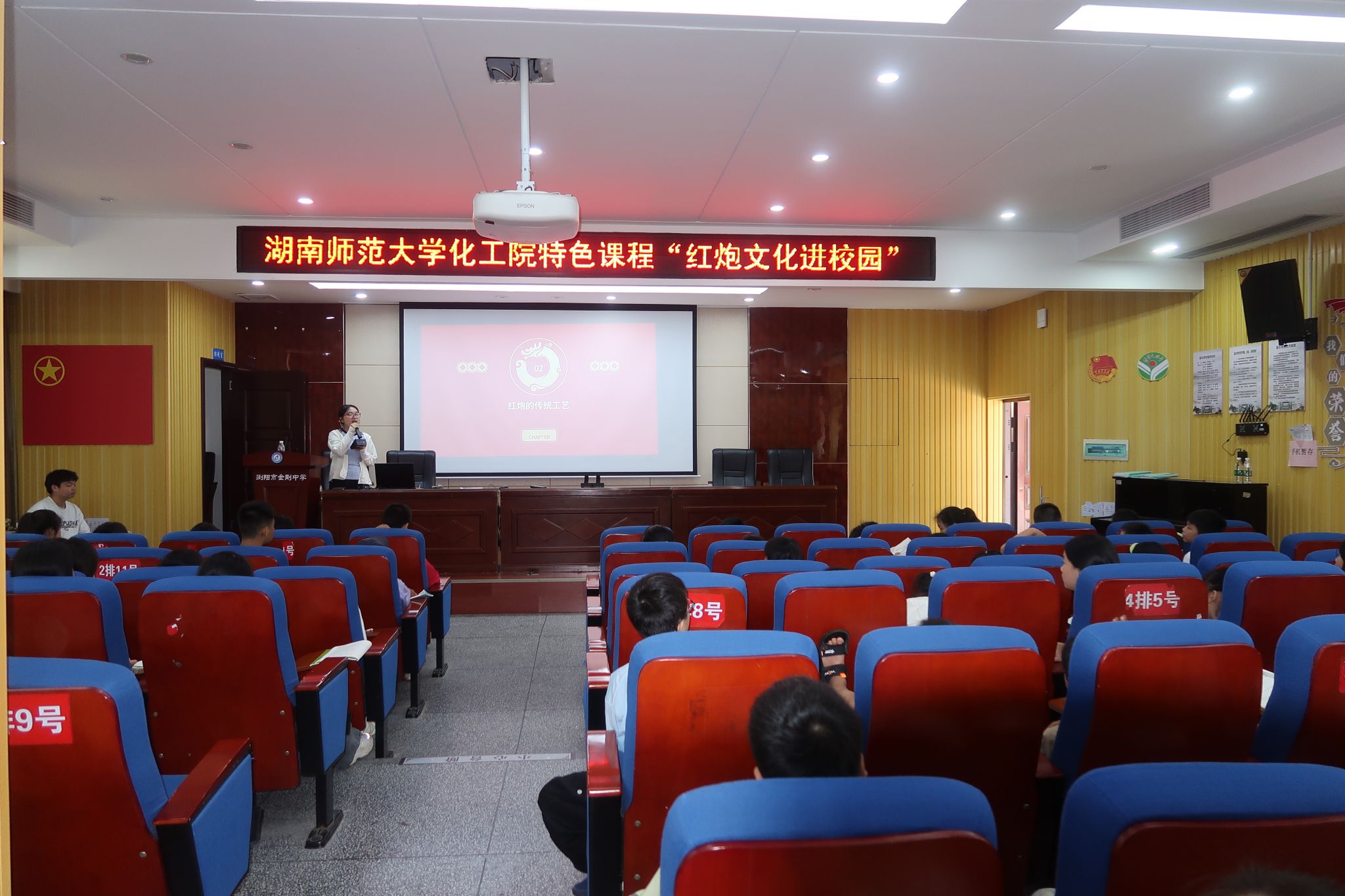 课程以红炮文化为核心,通过多元形式展开讲解。实践团成员借助图片、视频等形式,向学生介绍红炮的历史脉络与传统工艺中的科学智慧,展现从唐代“硝磺爆仗”到明清“架子烟花”的演变,解析古法火药配比与炮筒制作中的工艺原理。同时,结合现代产业发展,讲解全自动化生产线、环保材料应用等绿色科技成果,展示浏阳花炮在国际节庆中的应用场景。课程还聚焦安全知识,强调燃放场地选择、不同年龄段适用产品及应急处理等要点,阐明安全对文化传承的重要性。