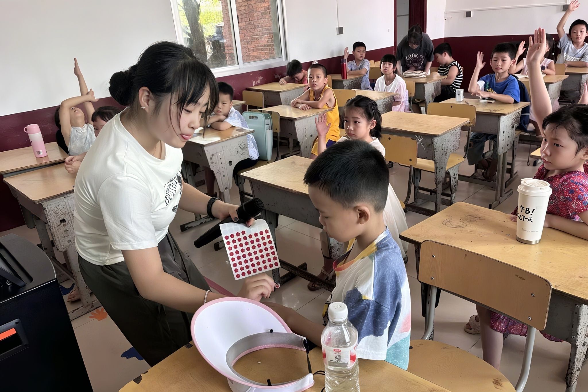 课程伊始,老师以橘子洲秋日实景视频作为动态导入,浩渺江景与万山红遍的镜头瞬间唤起学生对诗词意境的具象感知,自然衔接到《沁园春·长沙》的核心学习主题。老师采用分句领诵和集体跟读的双轨模式,带领一二年级学生通读全词,重点针对“舸”、“遒”等生字进行拼音标注与释义,扫除语音障碍。为检验学习成效,老师鼓励学生举手进行个体朗诵展示,并对声韵准确者给予课堂奖励。同学们积极举手并声情并茂地朗诵诗歌,展示自己对红色诗歌的理解。当所有学生展示完后,老师组织全体学生齐诵诗词,通过集体朗诵巩固学习成果。、