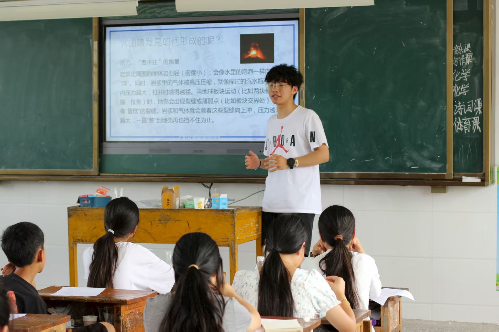 实验开始前,方子毅以真实火山爆发视频为导入,引出实验主题。随后,学生观看实验操作视频,直观了解此次实验的全流程。方子毅结合视频画面,强调操作要点,为后续实操环节作好铺垫。