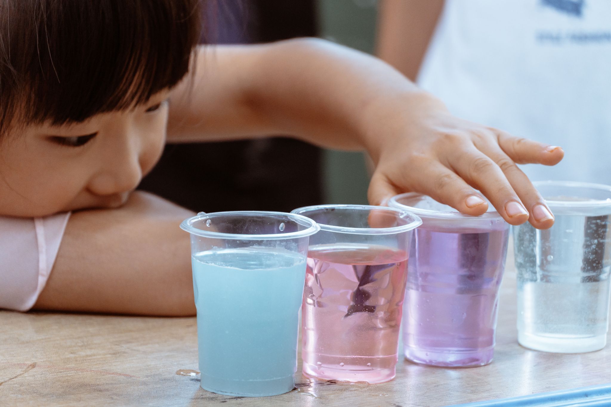 紫甘蓝汁由实践团成员课前提前准备完毕,作为实验的核心材料。实践团成员将其分发后,实验正式开始。在主讲人全程细致指导与示范下,同学们将不同液体倒入紫甘蓝汁:遇白醋、柠檬汁变为粉红,加小苏打溶液转成翠绿,接触肥皂水则呈深蓝色,引发同学们的好奇。