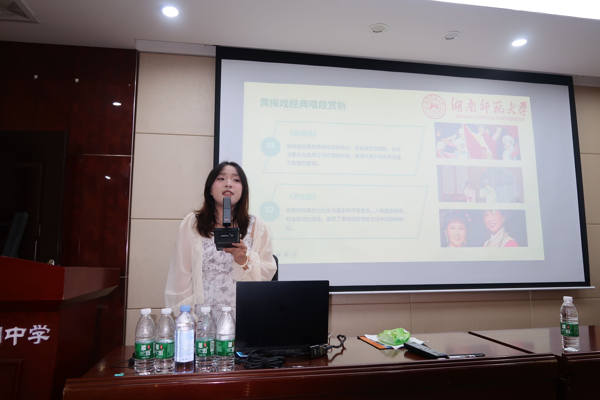 课程以经典湘剧花鼓戏曲目《刘海砍樵》为切入点,主讲人引领学生学唱经典选段,让大家在婉转旋律与生动唱词中感受湘剧魅力。学唱环节结束后,主讲人讲解湘剧中“高、低、起、落”的艺术特点,并着重介绍了唱腔韵味与表演方式,剖析湘剧独特艺术风格。除此之外,主讲人还拓展介绍越剧等其他剧种,对比不同戏曲艺术特色,拓宽学生戏曲文化视野。活动过程中,教学组通过《刘海砍樵》的创作背景讲述、现场表演示范和互动学唱等方式,将湘剧知识趣味呈现。学生们积极参与,跟唱经典唱段,踊跃提问交流,对传统戏曲文化的认知不断加深。