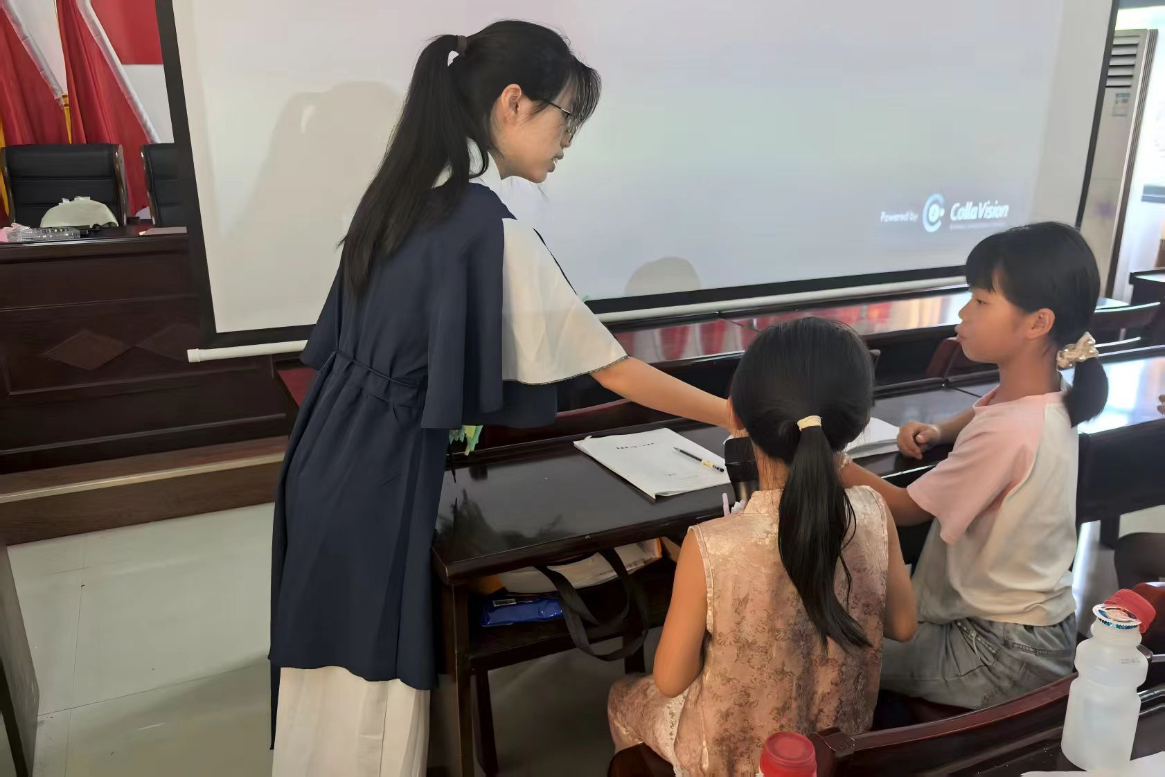此外,团队成员特别指出,在进行塑形操作的过程中,维护扭扭棒的整洁与有序有助于防止在制作过程中产生不必要的混乱与资源浪费。学生们专注于手工作业,团队成员协助学生调整细节。课程后半段,学生完成作品,团队成员组织拍摄学生作品,并与学生交流,了解其在手工过程中的感悟。