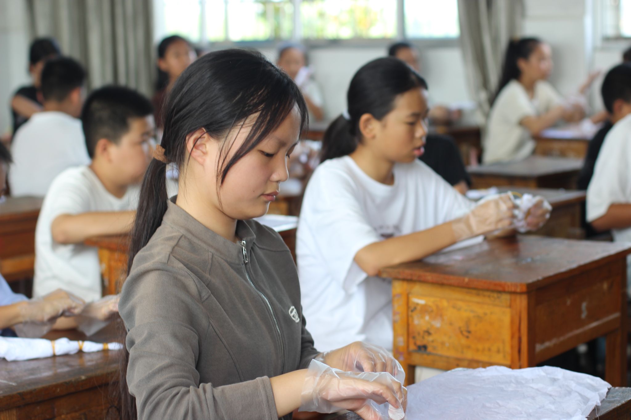 课堂伊始,张亚琳从扎染的历史讲起,介绍这一起源于黄河流域的古老工艺,随后在讲台上展示了棉麻面料、线绳、夹子等工具,以及提前做好的扎染成品,供孩子们传阅。