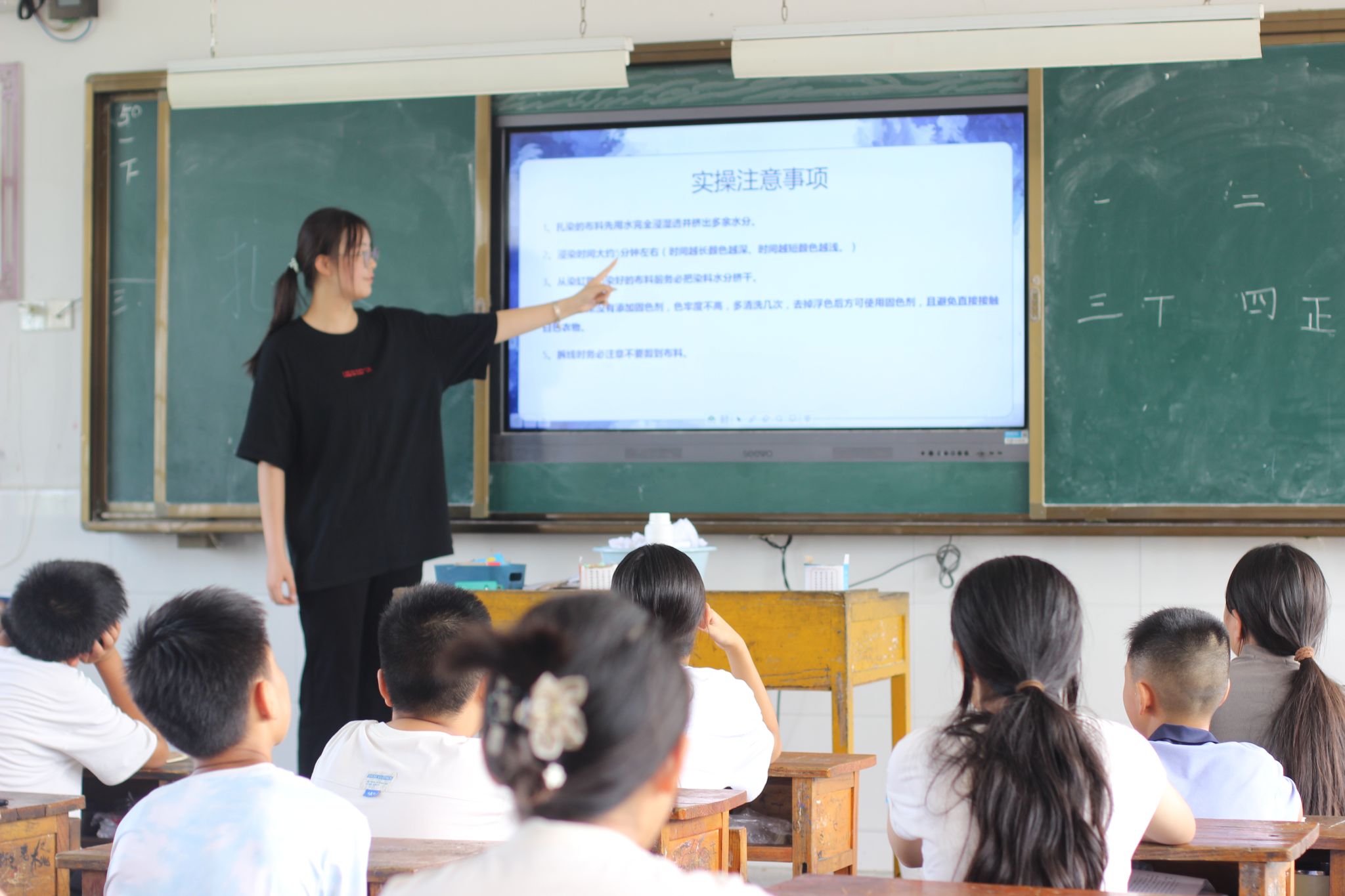 实践环节中,学生们在张亚琳的鼓励下大胆尝试:有的用橡皮筋捆出圆点,有的折叠后夹上木板,还有的尝试缝制简单图案。学生们互相交流想法,遇到难题时主动求助。实践团成员贺子妍则在台下指导,协助学生完成复杂操作。