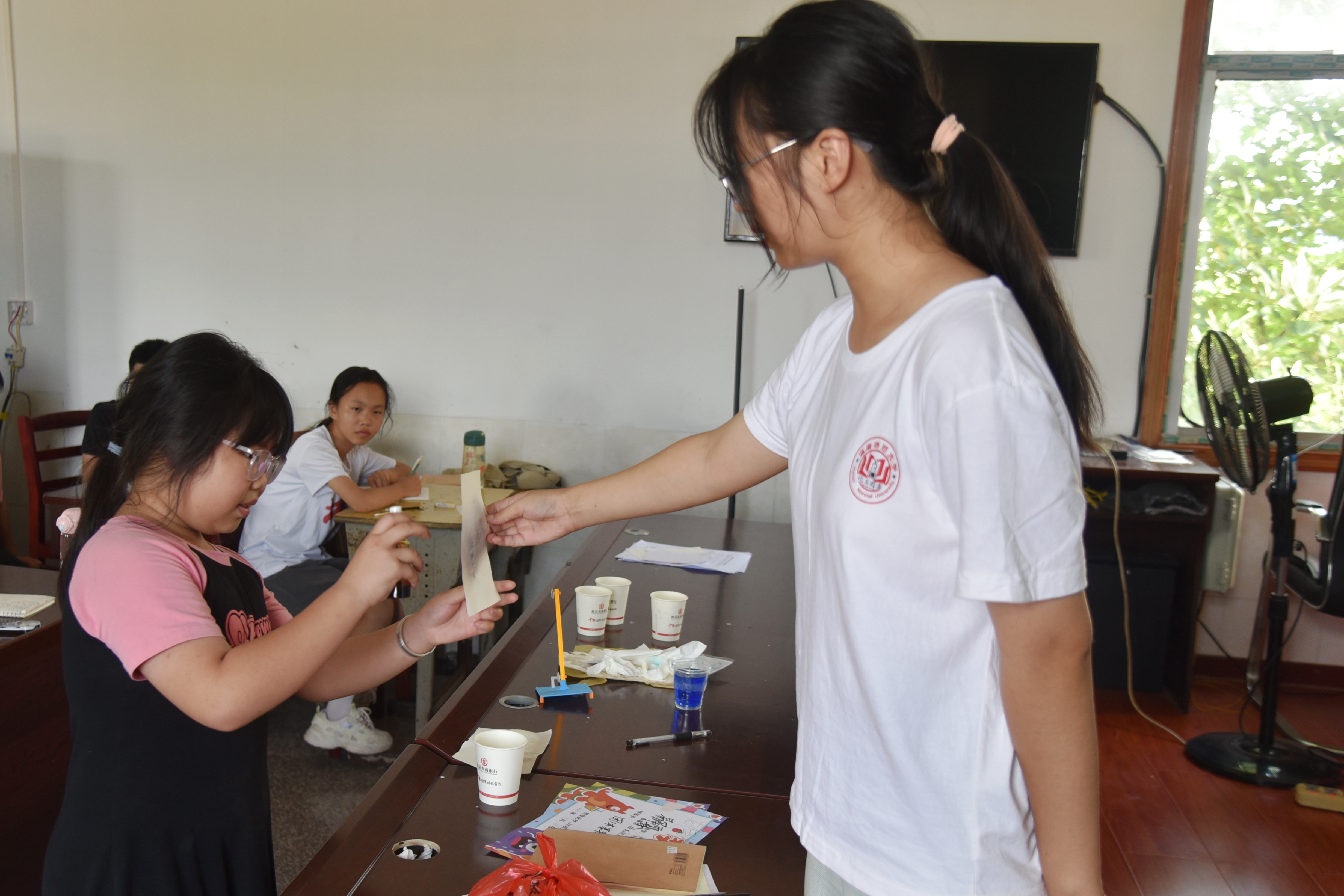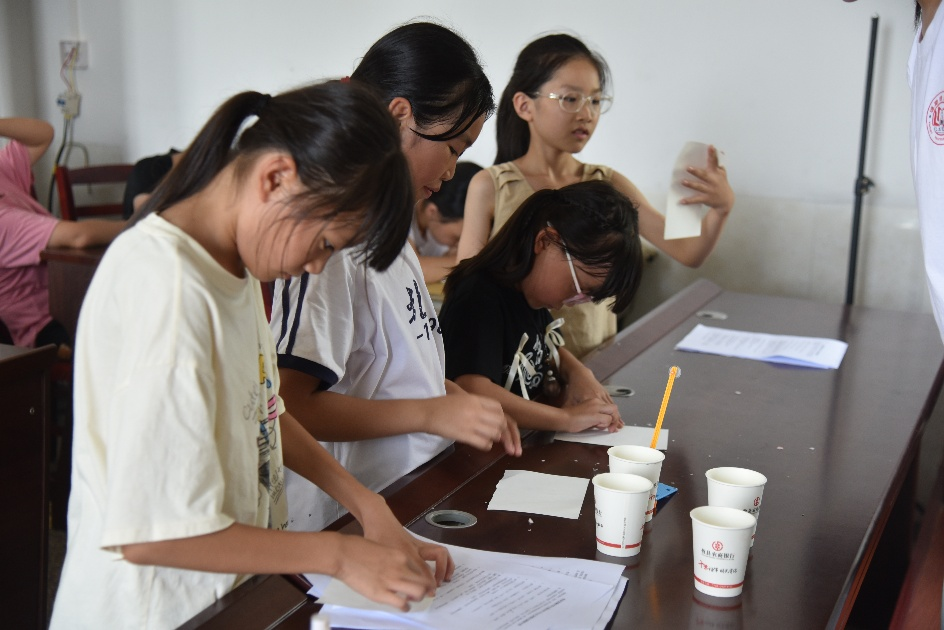 课程开始阶段,主讲人借动画片桥段导入,引起同学们的好奇心。为确保学生听课效果,课程设置“动手实验”环节。在主讲人的带领下,学生依次完成任务:用蜡烛在白纸上“预写”姓名,再刷水彩,蜡迹因拒水瞬间显现;以维C水作“隐形墨水”书写暗号,碘伏喷洒后蓝紫背景中浮出白色字迹;在纸角滴白醋并轻触烛焰,局部碳化呈现褐色图文,直观展示酸性物质加速纤维热解。为保障学生听课效果,主讲人利用实验间隙穿插讲解维C抗氧化、碘伏消毒原理及生活应用,引导学生记录现象、提出假设。