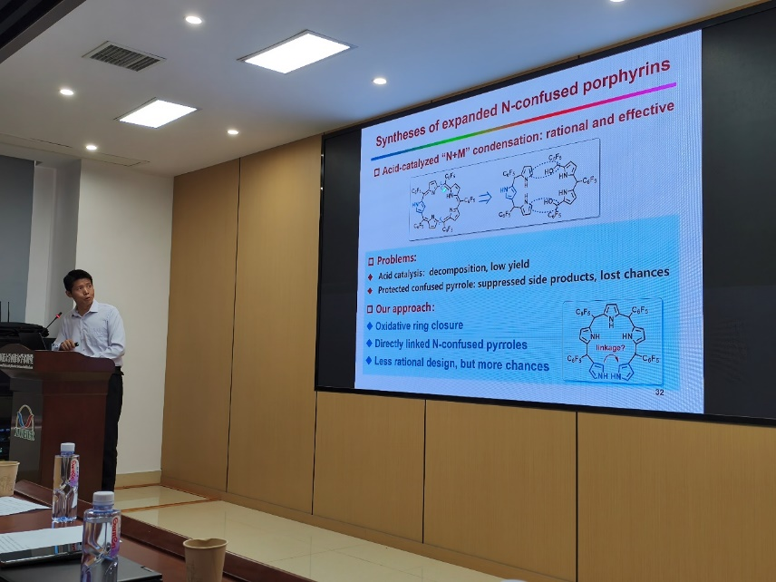 华东理工大学解永树教授的报告题目为《新型异卟啉研究-芳香性与光谱拓展》。报告伊始,解教授详细介绍了目前我国卟啉化学的研究团队以及在相关领域取得的最新研究进展,对yl34511线路中心在卟啉化学研究领域所做的相关工作进行了高度评价,随后介绍了他们课题组近年来在近红外卟啉类功能分子研发方面的相关进展,经过结构修饰和功能化衍生,实现了卟啉类功能分子吸收的极大红移,报告结束后与参会师生围绕近红外染料进行了长时间、深层次的探讨。