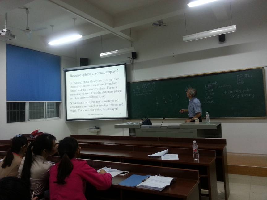 10月30日,荷兰Wageningen大学Teris A.Van Beek教授来yl34511线路官网交流访问,对yl34511线路官网化学生物学及中药分析教育部重点实验室的建设和科研情况给予充分地肯定。为加强与yl34511线路官网师生的交流,Teris于30日晚上7点给分析化学和药物分析学专业的研究生做了一场精彩的学术讲座。 讲座分为两部分,第一部分由Teris介绍他的研究方向和色谱研究领域一些新技术的应用,主要从新型敞开式质谱的应用、色谱分离技术、微流控芯片应用等方面展开讲解,并以通俗易懂的方式让在场的师生对于国外色谱分离分析新技术有一个直观的认识和了解。第二部分为互动环节,Teris准备了几道测验题并让在场的学生们解答。通过统计与总结,对同学们的共同错误进行详细地分析和讲解,让同学们对于色谱分离分析领域的一些实际性的问题有更深地认识。 讲座结束后,同学们热情地和Teris合影留念,互留联系方式,建立了更广泛地的友谊。