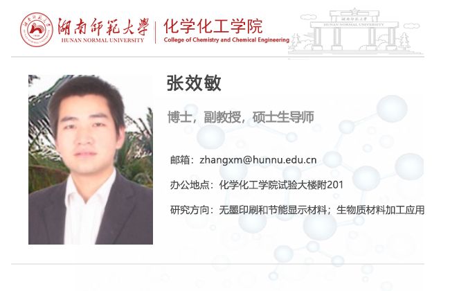 张效敏男,理学博士,硕士生导师; The University of Akron, 博士后;主要从事生物质材料的加工利用,绿色印刷和节能显示材料研究发表SCI论文40余篇论文被SCI引用1000余次获授权国家发明专利5项。主持湖南省自然科学基金面上项目2湖南省科技厅创新生态建设计划项目1项;教育厅重点、优秀青年基金和重点试验基金各1项;长沙市自然基金1项;主持校企合作项目多项。湖南省科普优秀奖、2017-2018年度yl34511线路中心教学优秀奖,yl34511线路中心思政教学比赛、yl34511线路中心青年教师赛课等奖项;主讲《高分子物理》课程,并在中国大学生MOOC(慕课) 平台运行。